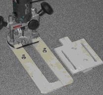 • Setzt die Oberfraese auf die Grundplatte und zeichnet den Kreisausschnitt des Fraesers an. Zeichnet auch die Lage der Halteschrauben und den Ausschnitt für den Laeufer an.